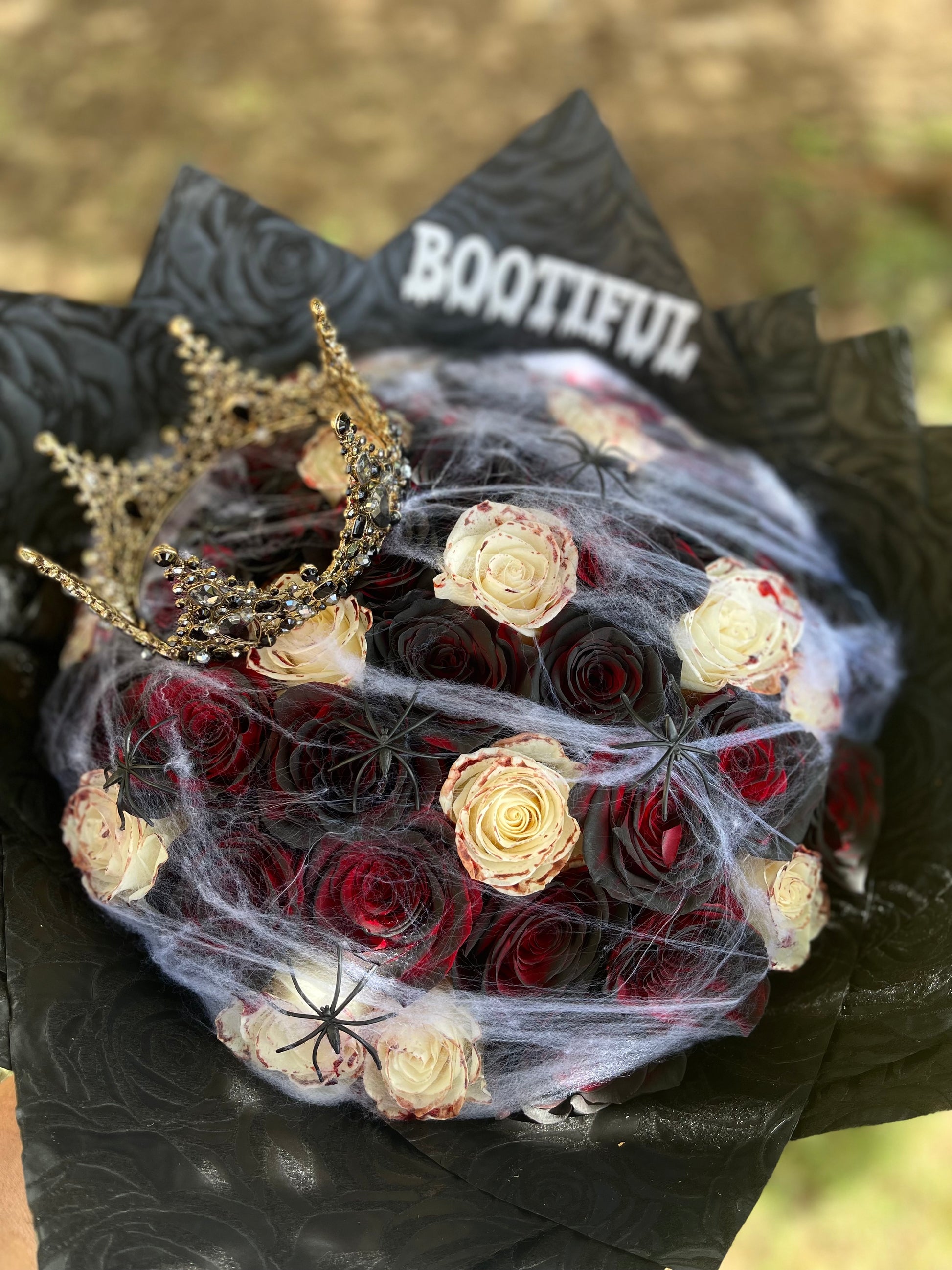 50 black, red and white rose bouquet with spiders and spider webs