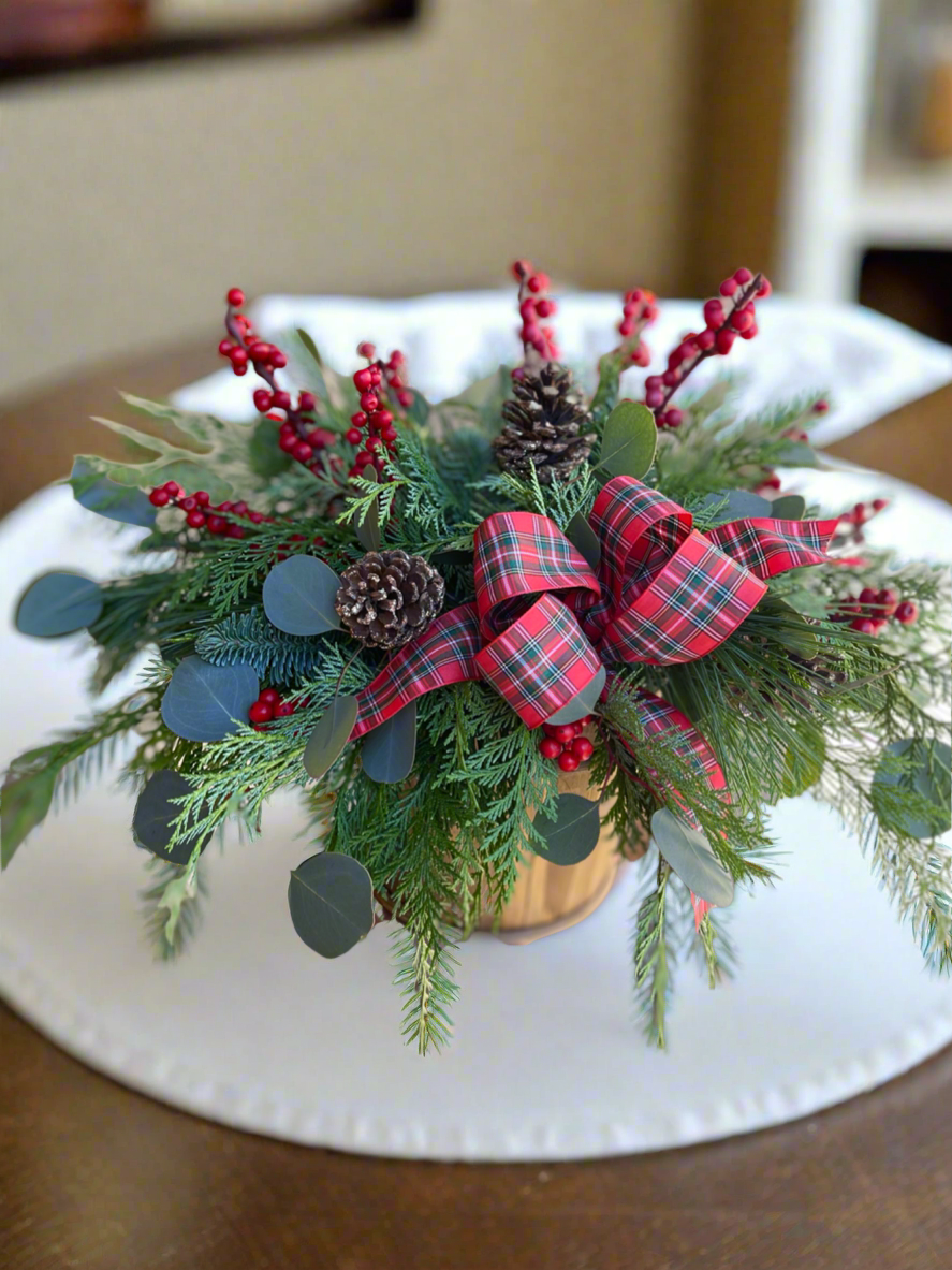 Transform your Christmas dining table into a serene winter escape with our "Winter Woodland" bouquet. This enchanting centerpiece features a harmonious blend of lush eucalyptus leaves, delicate pine fronds, and charming acorns, evoking the beauty of a tranquil forest in the heart of winter.